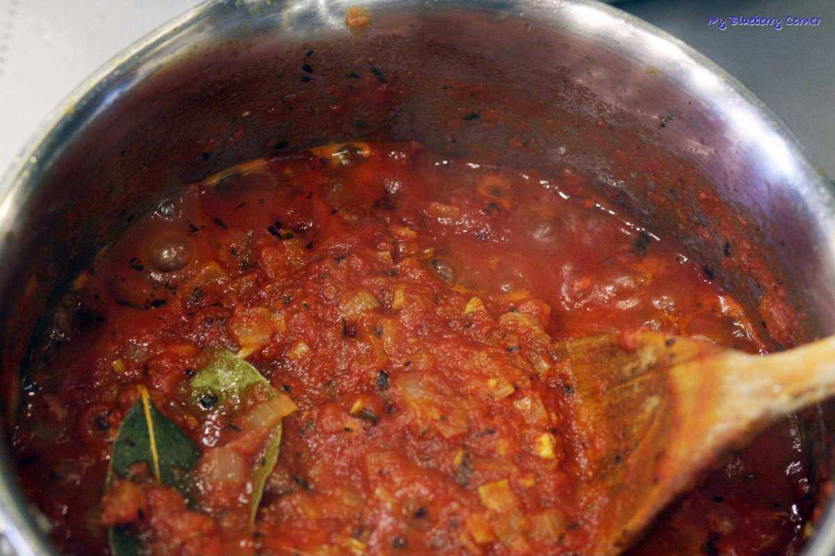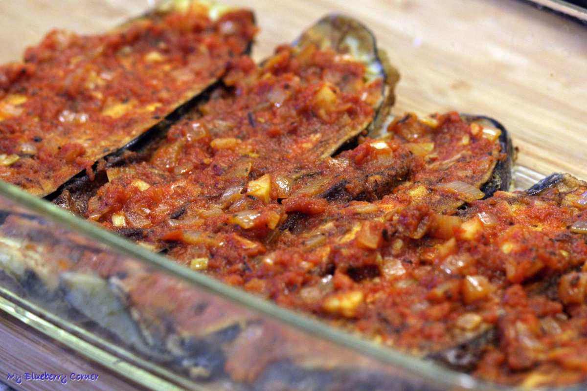 Pokroić bakłażany w dosyć grube (ok 1,5 cm) plastry. Ja preferuje cięcie wzdłuż, ale można też pokroić w poprzek. Posolić go i odstawić na pół godziny. W tym czasie pokroić cebulę w dosyć sporą kostkę, czosnek przecisnąć przez praskę. W rondelku rozgrzać 2 łyżki oliwy, dodać oregano i pozostałe zioła. Po chwili dorzucić cebulę z czosnkiem i smażyć przez kilka minut. Następnie dodać pokrojone w kostkę pomidory, liście laurowe, ocet, sól i pieprz. Gotować na małym ogniu przez 10-15 minut, aż zgęstnieje.