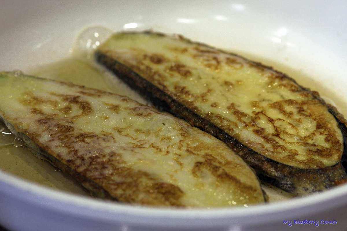 Spróbować i ewentualnie doprawić sos do smaku solą i pieprzem. Bakłażana opłukać z soli i osuszyć ręcznikiem papierowym. Rozbić jajko w głębokim talerzu i wymieszać z mlekiem. W drugim talerzu wysypać mąkę. Rozgrzać dużą patelnię z olejem. Bakłażany moczyć w mące, potem w jajku (nie będzie spalonej mąki). Smażyć partiami, z obydwu stron na złoty kolor.