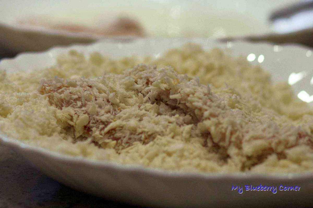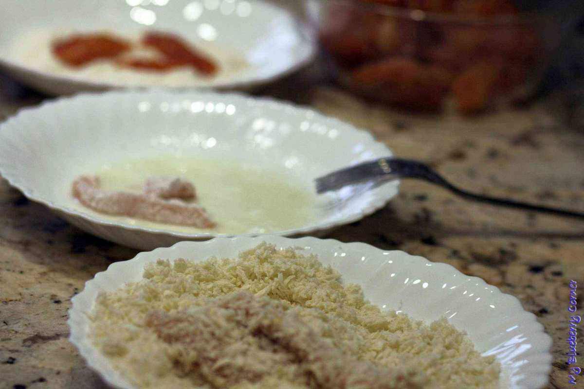 Jeden z mąką, drugi z jajkiem zmieszanym z mlekiem (ja użyłam samych białek, które zostały mi z pieczenia ciastek), trzeci z panierką panko. Kurczaka najpierw obtoczyć w mące, potem zanurzyć w jajku, następnie oblepić w panko.