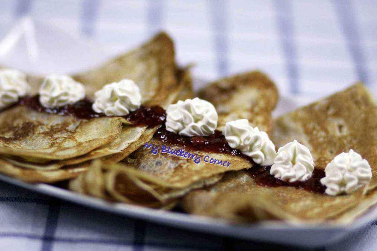 Naleśniki z dżemem truskawkowym i bitą śmietaną mogą być zarówno wyśmienitym deserem jak i daniem głównym w upalny letni dzień. Są doskonałe na śniadanie, lunch lub pyszny podwieczorek. Te naleśniki są cienkie, lekko chrupiące i aromatyczne. Przepis na „crepes” zaczerpnęłam z książki Gordona Ramsay’a „JUST DESSERTS”. Książkę z osobistą dedykacją od Gordona dostałam bardzo dawno temu, gdy nawet jeszcze nie śniłam o własnym blogu. Ostatnio wpadła mi w ręce i teraz mogę zastosować w praktyce te wyszukane przepisy.