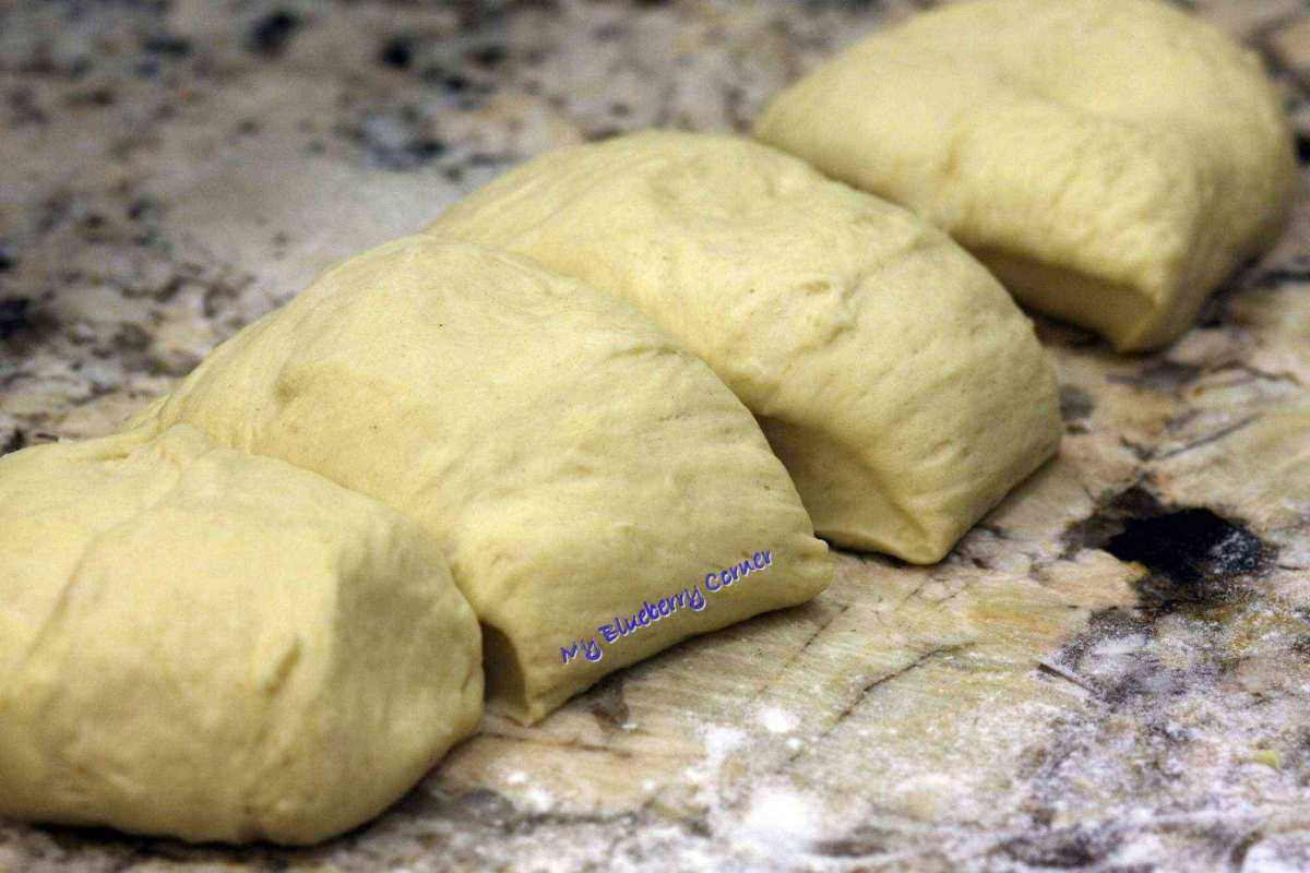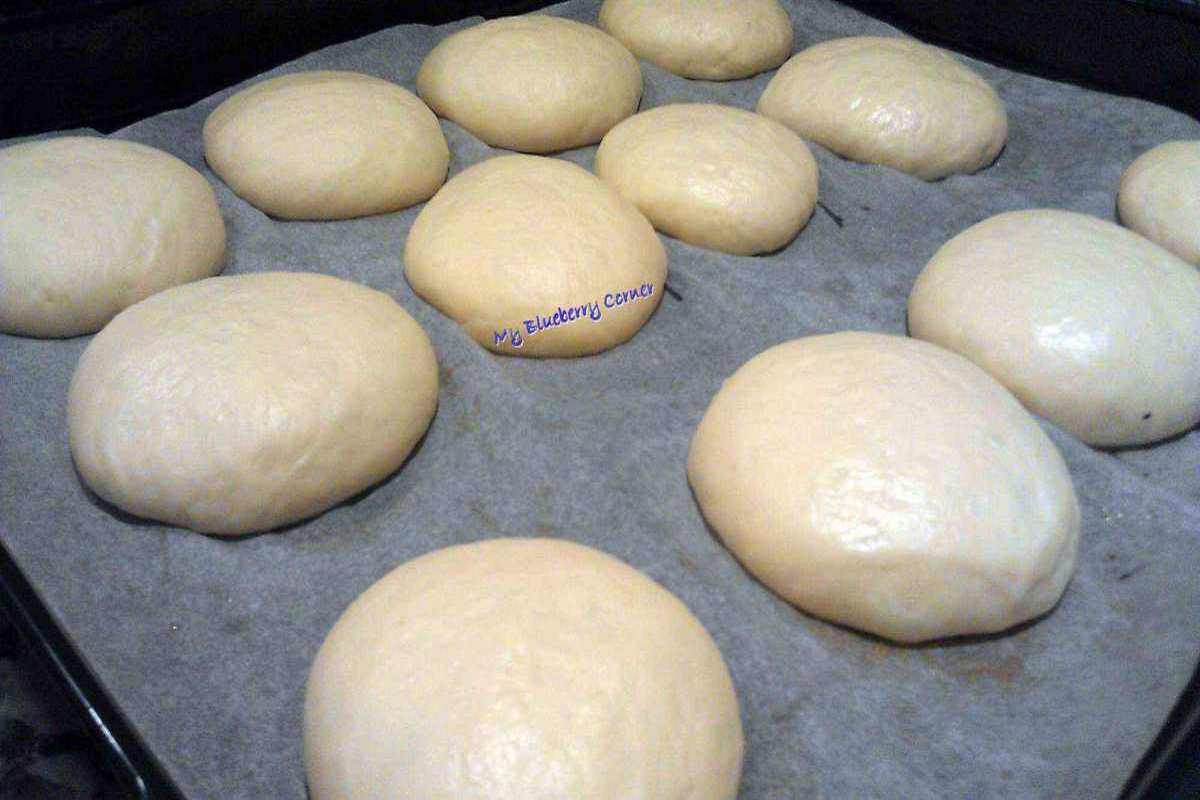 Gdy ciasto wyrośnie, wyciągnąć je z miski, uformować wałek, podzielić na 16-18 części. Z każdej porcji uformować kulkę, ułożyć na blachach wyłożonych papierem do pieczenia i lekko spłaszczyć.