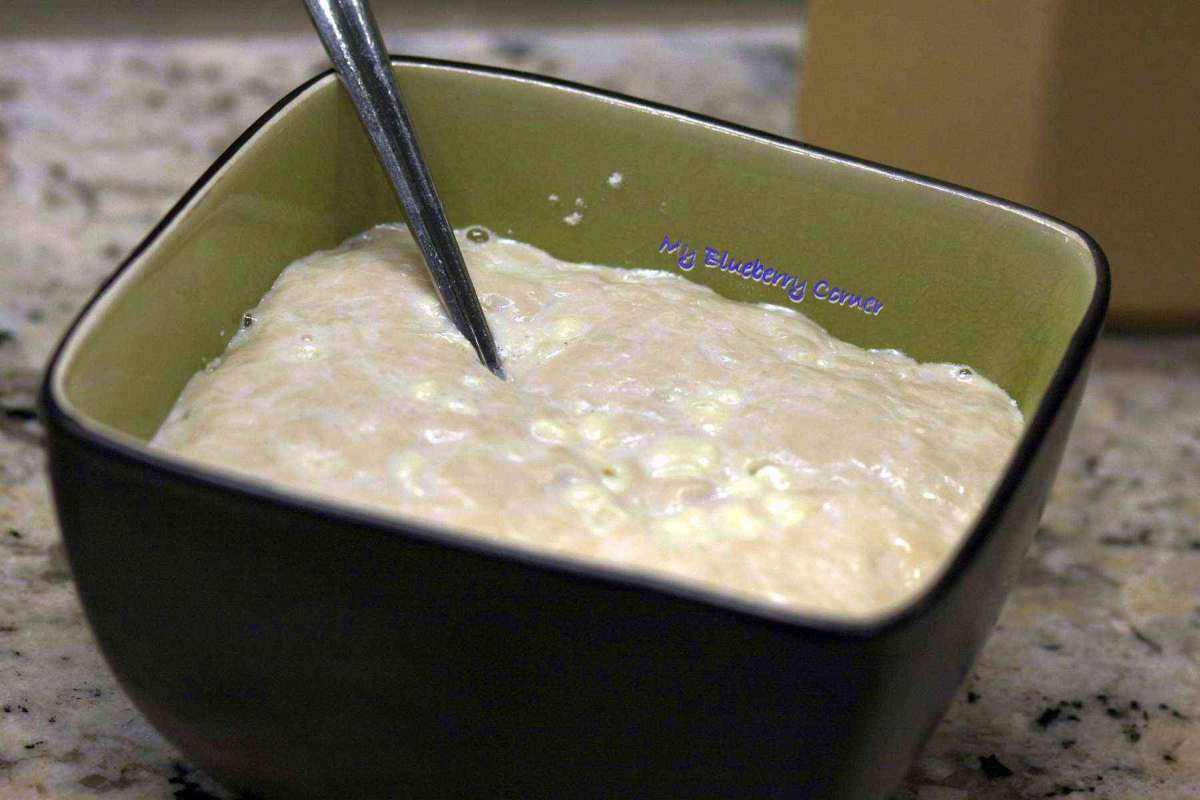 Drożdże pokruszyć do miseczki, zalać 3 łyżkami letniego mleka. Dodać 1 pełną łyżeczkę cukru.