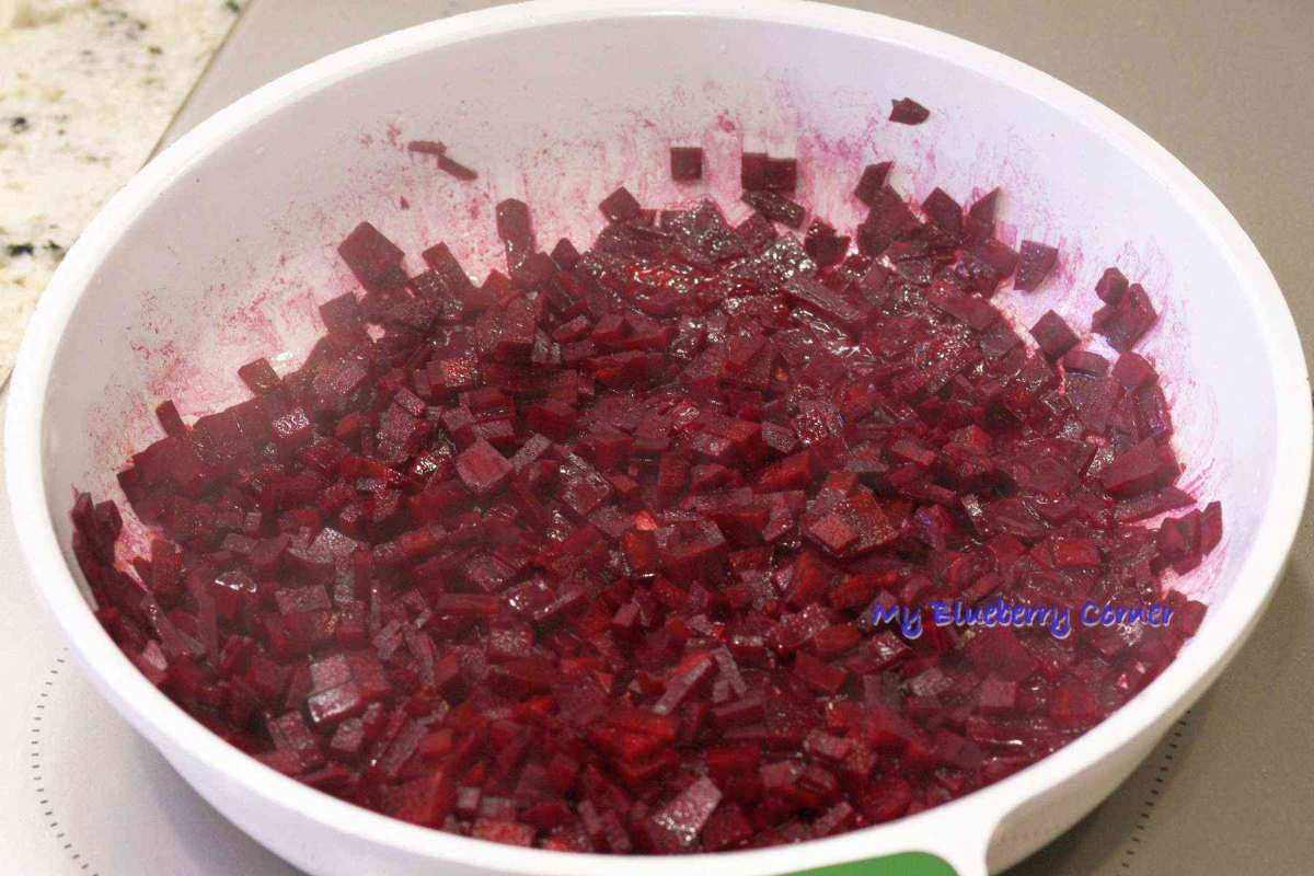 Botwinę umyć. Buraczki odciąć od liści, obrać i bardzo drobno pokroić.