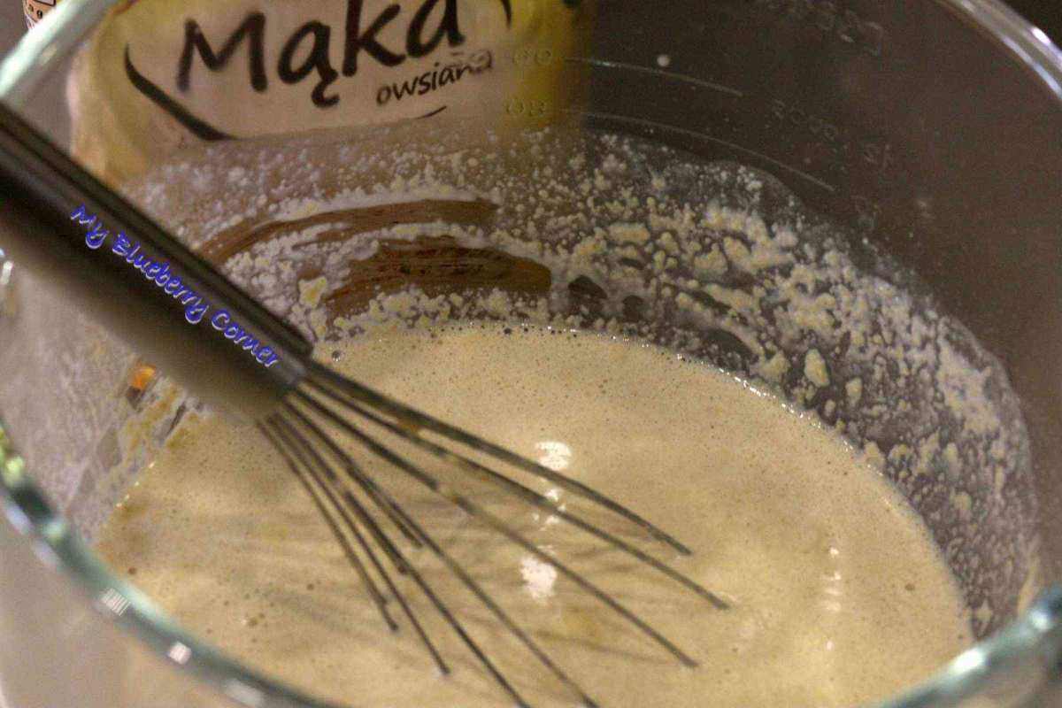 Szklankę mleka podgrzać, aby było ledwo ciepłe. W sporej misce wymieszać mleko z miodem, dodać pokruszone drożdże. Po ok. 10 minutach dodać resztę mleka i owsianą mąkę.