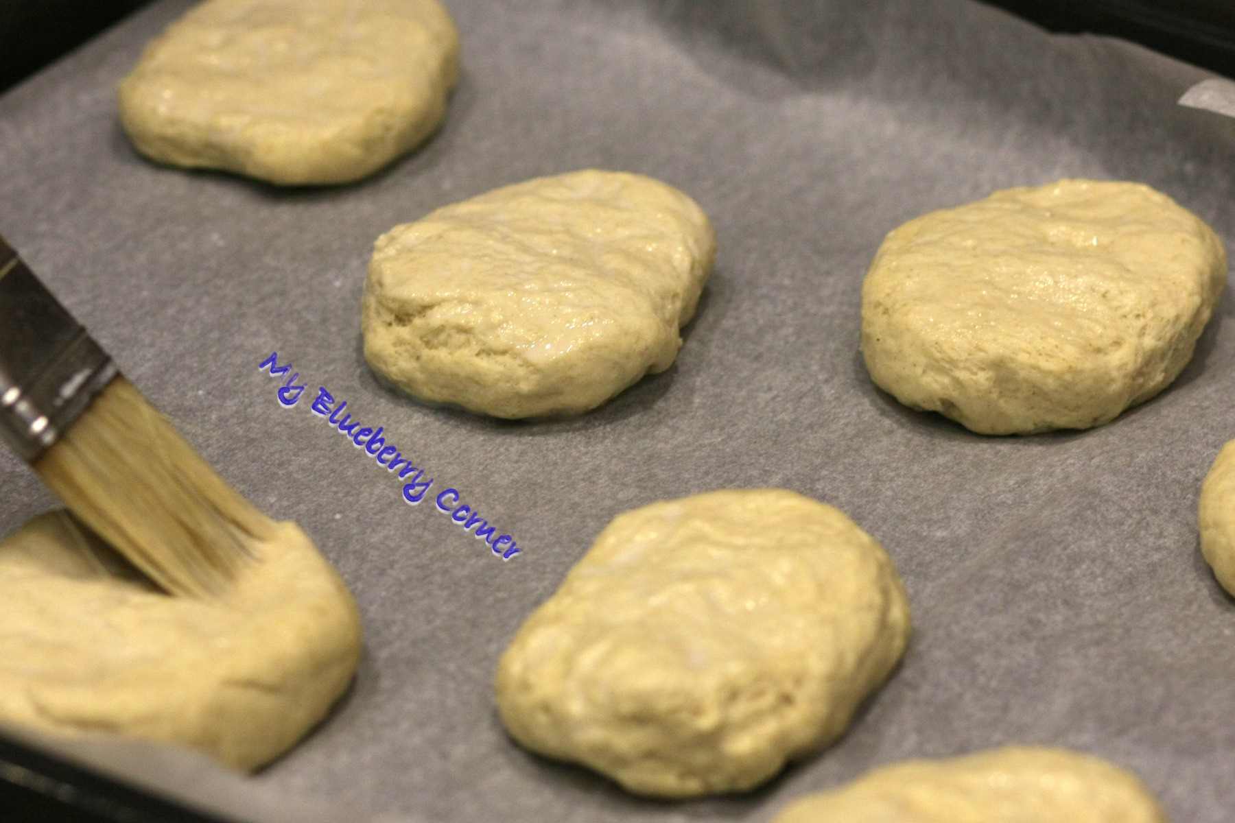 Posmarować mlekiem (płatki będą się lepiej trzymać), posypać płatkami i ustawić na min. 20 minut w ciepłym miejscu (ja wstawiłam blachy do piekarnika ustawionego na rozmrażanie – 35°C).