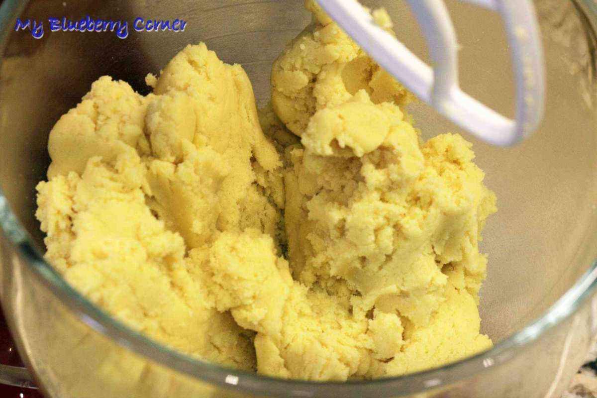 Ja przygotowałam ciasto przy pomocy robota, ale można je po prostu zagnieść. Na pół godziny przed zaczęciem ciasta, miskę i mieszadło schować do lodówki. Po tym czasie miskę wyjąć, wkroić masło, dodać mąkę, sól, proszek, cukier i żółtka i szybko wymieszać zimnym mieszadłem.