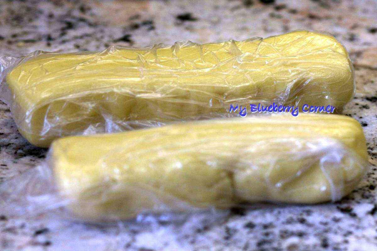 Wyrabiać, aż wszystkie składniki się skleją w jedną gładką masę. Ciasto podzielić na dwie części (najlepiej zrobić dwa rulony) w stosunku 3:2, każdy oddzielnie zawinąć w folię spożywczą (lub foliowy woreczek) i schować na ok. 30 minut do zamrażalnika.