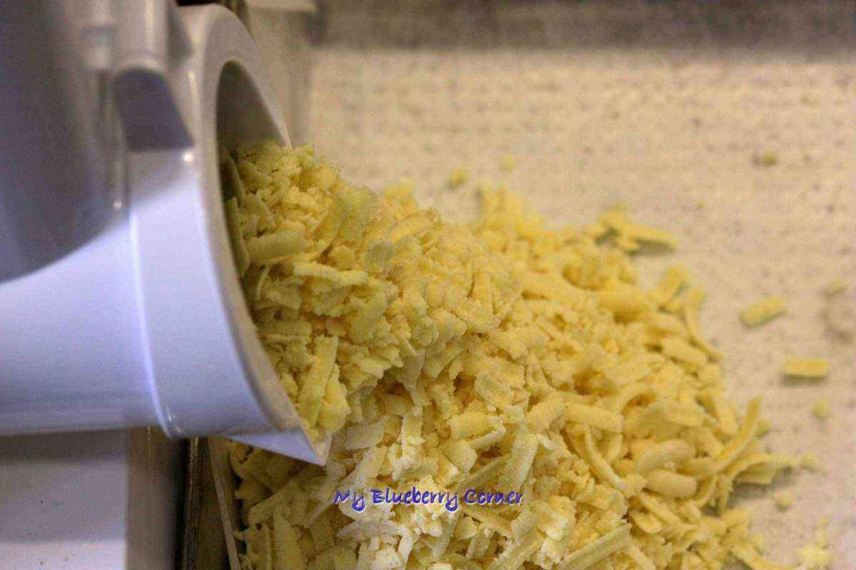 Ciasto w ręku zawsze się trochę roztapia, a ręka szybko się męczy. Maszyna radzi sobie bardzo dobrze i wiórki są akurat. Najlepiej zetrzeć je do formy, rozsypać, potem lekko docisnąć do dna.