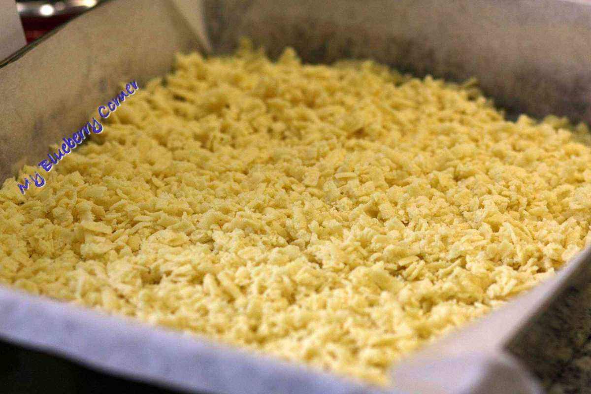 Po tym czasie wyjąć większą porcję i zetrzeć na tarce o grubych oczkach, na dno wyłożonej papierem do pieczenia formy. I tu wpadłam na pomysł, żeby ciasto zetrzeć maszynce z przystawką do tarcia – genialne.