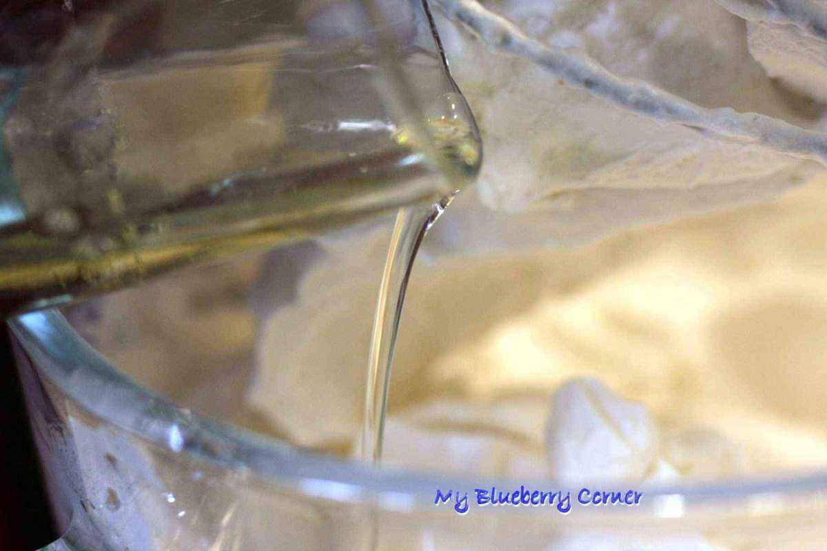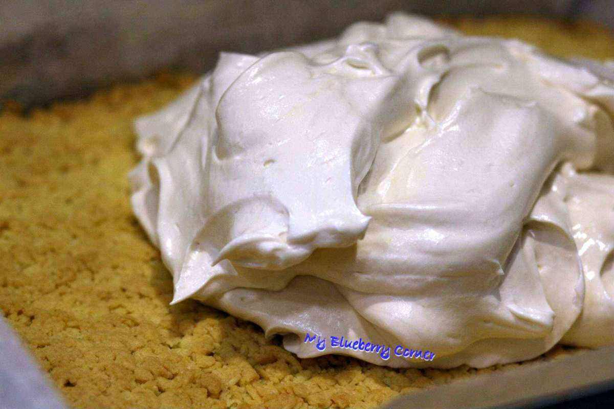 Wyjąć i odstawić do ostudzenia. W tym czasie trzeba pokroić owoce i przygotować piankę. Białka z dodatkiem szczypty soli ubić, gdy piana zacznie sztywnieć dodawać małymi porcjami cukier. Gdy cały cukier zostanie wmieszany dodać ekstrakt waniliowy a potem budyń. Pianę trzeba cały czas mieszać. Na końcu dodać olej, powoli, małymi porcjami (lub malutkim ciurkiem).