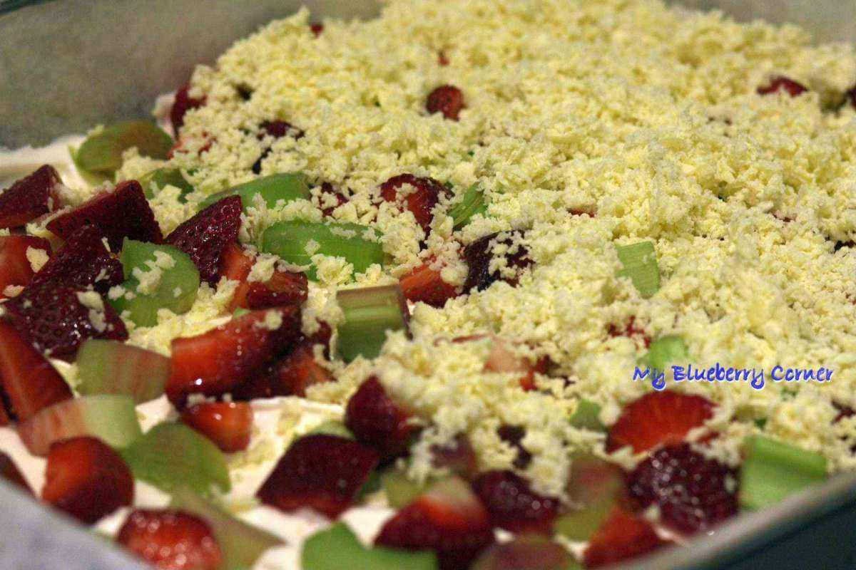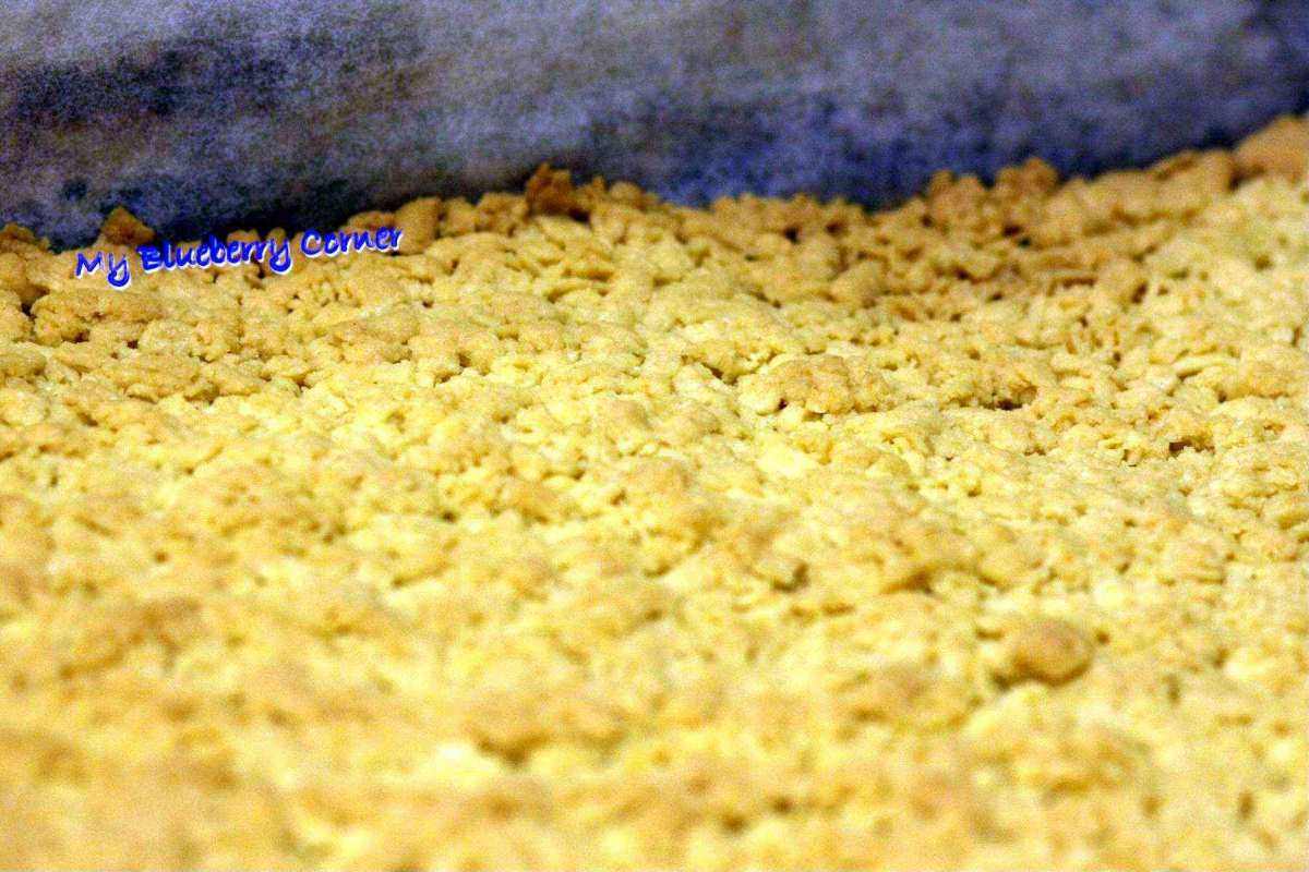Rozsmarować równo (w tym celu użyć wybieraka do ciasta), a na piance ułożyć pokrojone owoce. Na owoce zetrzeć drugą część ciasta z zamrażalnika (ja znów użyłam maszyny).