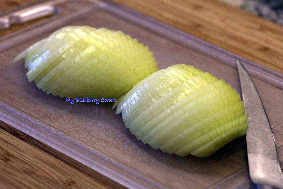 Obrać i pokroić cebule na półplasterki.