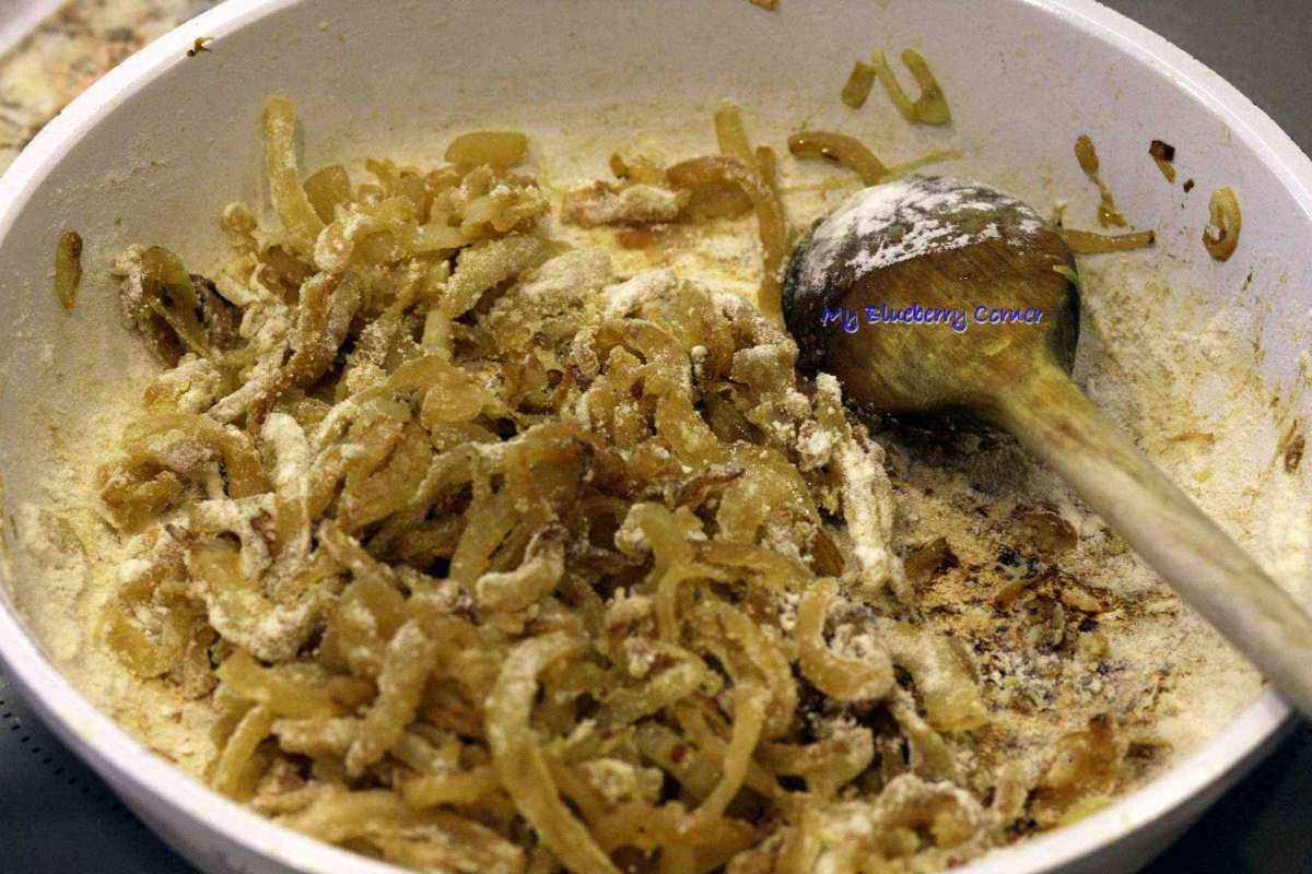 Usmażyć cebule na rumiano, zasypać mąką (mąka nie jest obowiązkowa) i jeszcze chwilę podsmażyć, wrzucić do kapusty, energicznie wymieszać, wyłączyć.