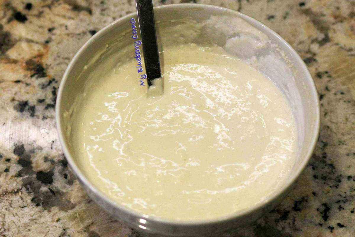 Przygotować dressing. Czosnek obrać. W miseczce zmieszać jogurt, majonez, przeciśnięty przez praskę czosnek.