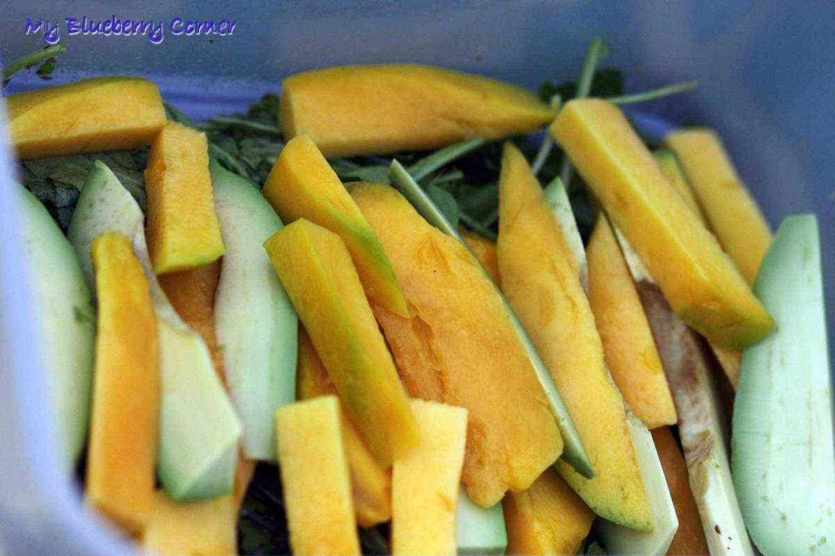 Szczelnie zamknąć i wstrząsnąć, aż składniki się dobrze wymieszają. Liście rukoli wrzucić do salaterki (ja przygotowywałam sałatkę w działkowych warunkach i użyłam plastikowego pojemnika). Mango obrać odkroić od pestki i pokroić na grube słupki (jak frytki). Awokado przekroić na pół, usunąć pestkę, obrać i pokroić jak mango.
