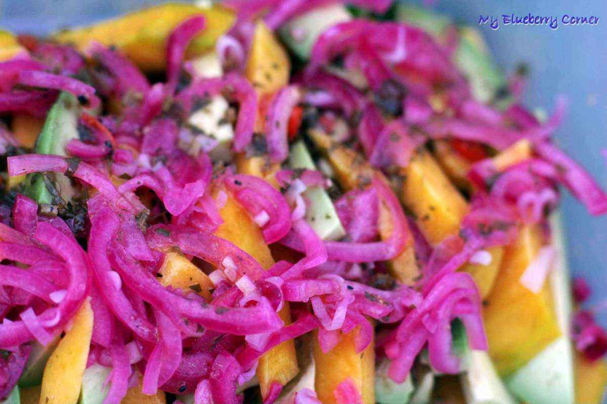 Ułożyć na rukoli. Na to wyłożyć marynowaną cebulę. Posolić, popieprzyć i polać dressingiem. Egzotyczna sałatka z awokado i mango musi być podawana natychmiast po zrobieniu. U mnie postała około pół godziny i rukola się zmacerowała (zmiękła i zmieniła kolor).