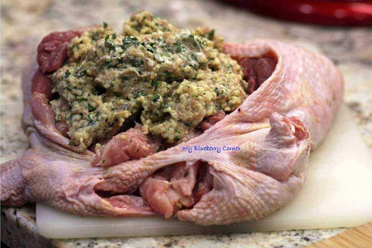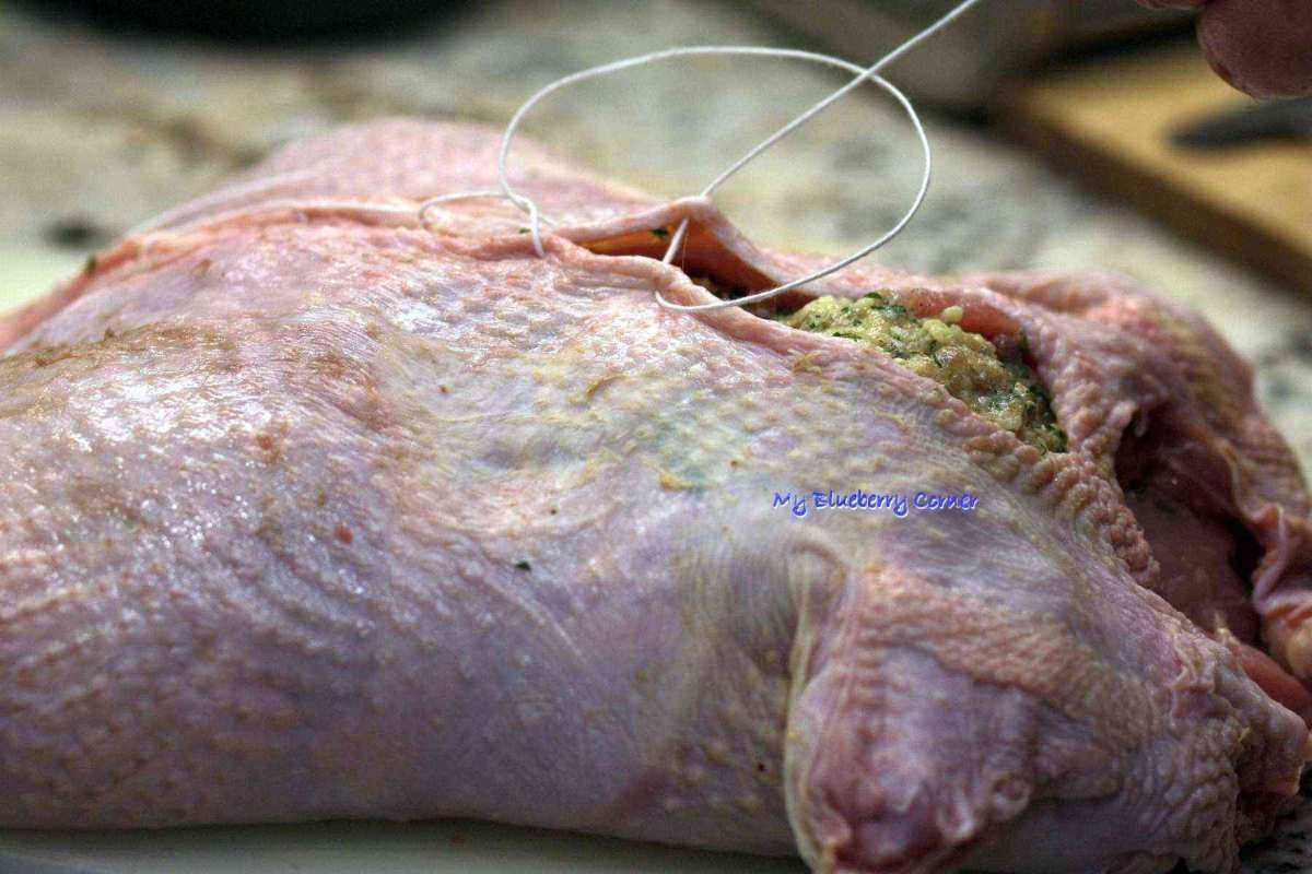 Farsz ułożyć wewnątrz tuszki kurczaka, wypełniając także wyluzowane nogi,ładnie uformować. Teraz czas na zszycie balotyny.