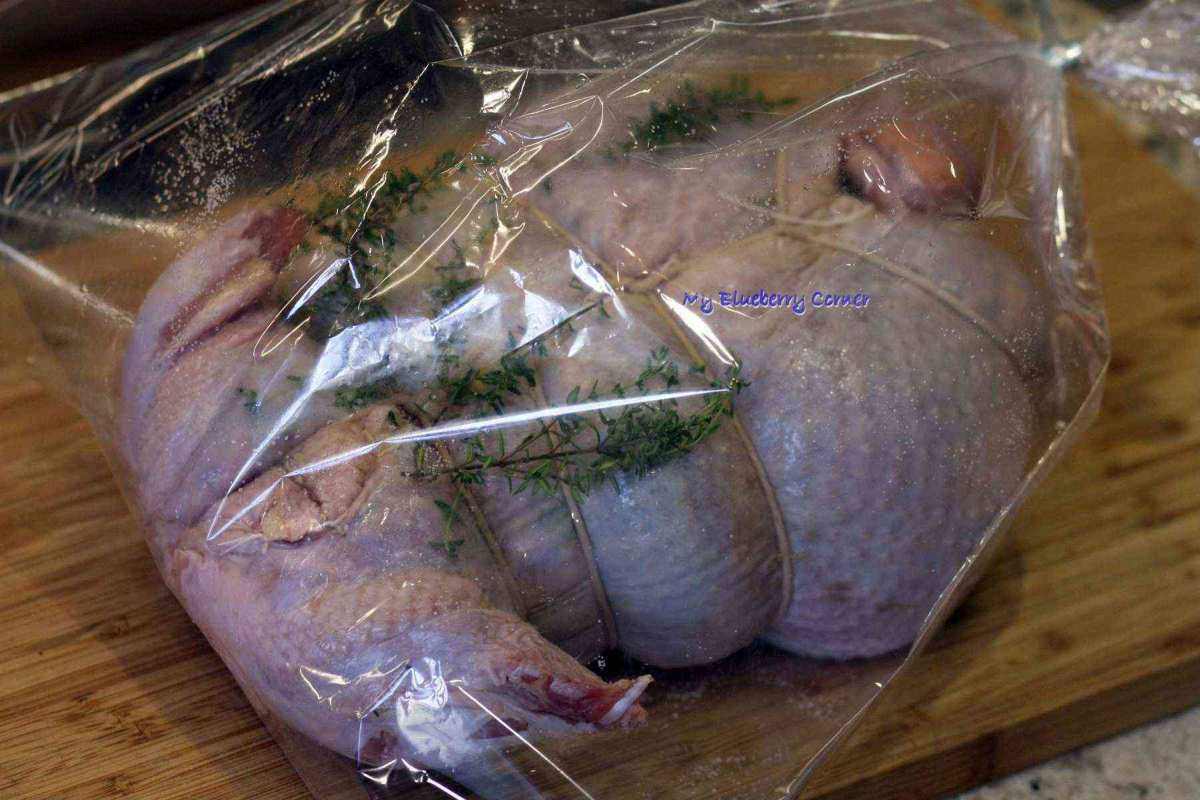 Balotynę umieścić w rękawie foliowym razem z kilkoma gałązkami świeżego tymianku i wstawić do piekarnika na 1 godzinę. Folię naciąć i zlać sos do sosjerki.