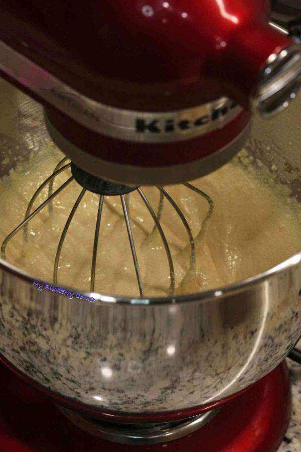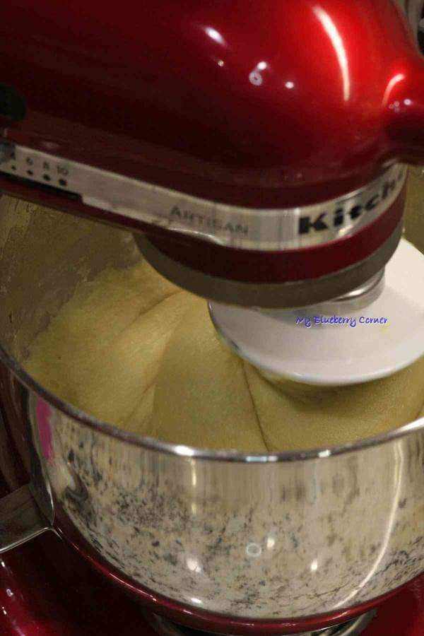 W tym czasie ubić żółtka z cukrem na puch (jeśli cukier zbyt długo się nie rozpuszcza, można dodać kilka łyżek letniego mleka). Dodać pozostałe mleko, zaczyn, masło, zapach i mąkę i mieszać (ręcznie lub przy pomocy robota), aż ciasto zrobi się sprężyste.