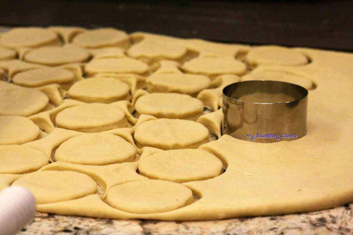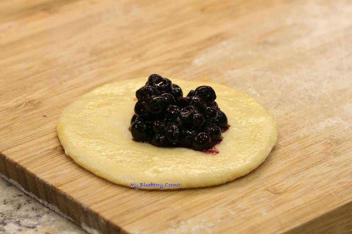 Przy pomocy dużej szklanki lub pierścienia do wykrawania o średnicy ok. 7 cm. Wykroić jak najwięcej placków. Pozostałe, niewykorzystane ciasto zagnieść ponownie i schować do pojemnika z pokrywką, żeby nie wyschło i odłożyć – ciasto powinno odpocząć. Jagody wymieszać z cukrem i skrobią kukurydzianą. Wykrojone drożdżowe placki lekko rozciągnąć, brzegi posmarować białkiem i napełnić jagodami.