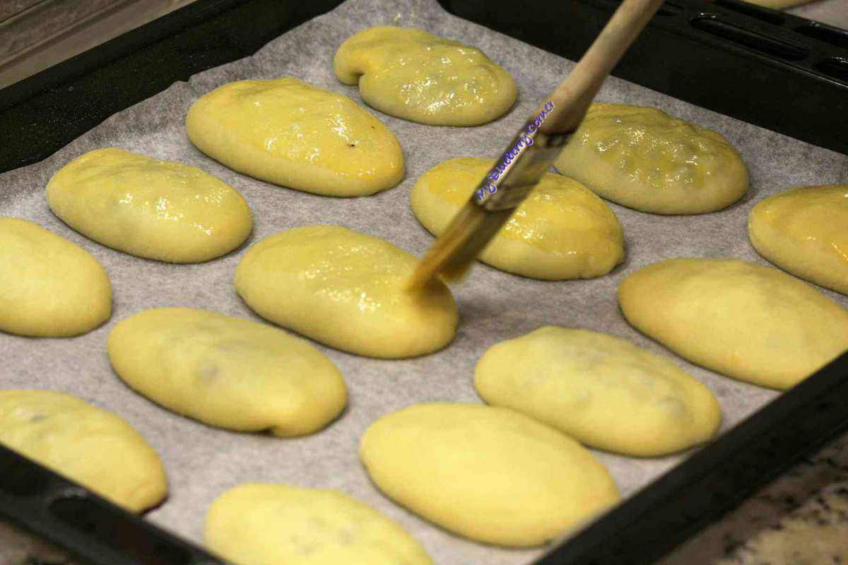 Brzegi ciasta dobrze skleić. Bułeczki układać sklejeniem do dołu na blachach wyłożonych papierem do pieczenia. Odstawić do wyrośnięcia, na 30 minut w ciepłe miejsce (można schować do piekarnika nastawionego na rozmrażanie – 35°C). Tuż przed pieczeniem bułki posmarować roztrzepanym żółtkiem.