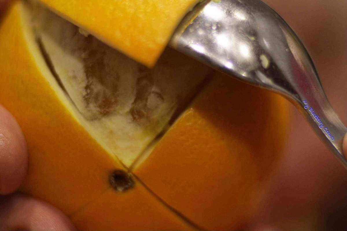 Pomarańcze dobrze umyć i sparzyć wrzątkiem. Podzielić (nacinając) skórkę pomarańczy na cztery ćwiartki i przy pomocy łyżki zdjąć ją z owocu.