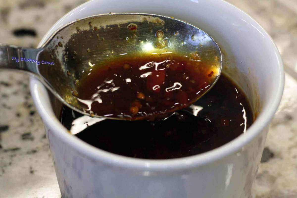 W kubeczku wymieszać sos sojowy, ocet ryżowy, olej sezamowy, Sambal Oelek, sos słodko-kwaśny i wodę.