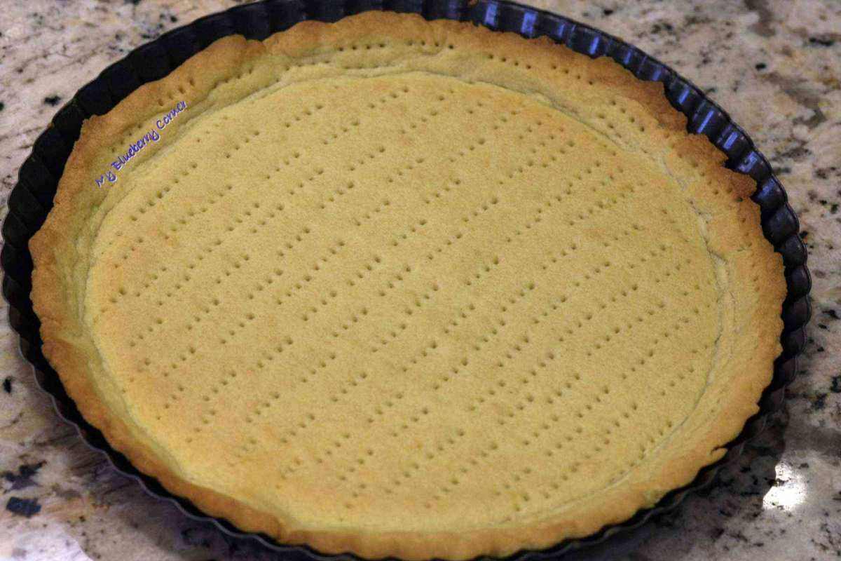 Zimne ciasto rozwałkować na placek wielkości formy do pieczenia tarty (dno średnicy ok. 24 cm plus ranty), przełożyć na wałku do foremki, lekko przygnieść do dna. Żeby nie powstały purchle, tartę ponakłuwać widelcem. Wstawić do nagrzanego do 180°C piekarnika (ustawionego na tradycyjne grzanie góra i dół) na 30 minut.