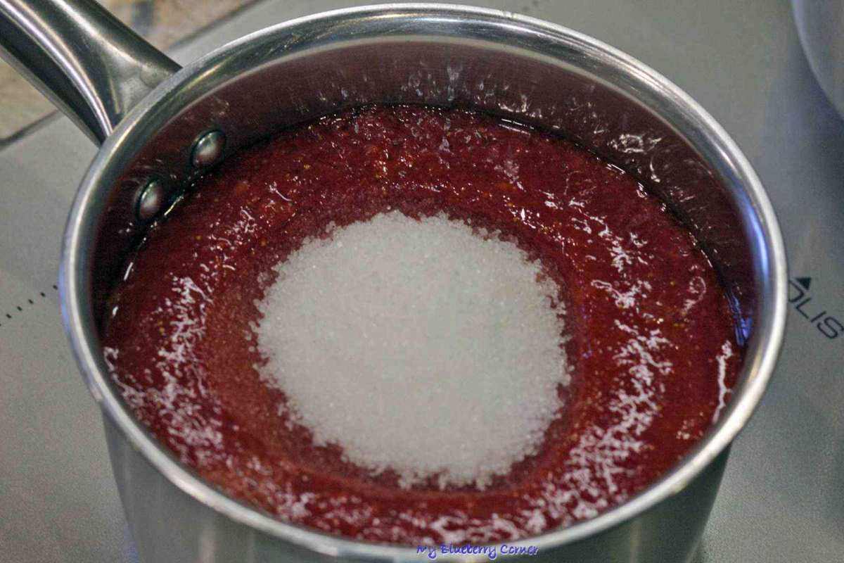 Podgrzać nie dopuszczając do zagotowania. Przetrzeć przez drobne sito, żeby pozbyć się skórek i twardych pestek. Żelatynę wsypać do szklanki i zalać 3 łyżkami zimnej wody. Gdy napęcznieje podgrzać ją w mikrofalówce (nie dopuszczając do wrzenia) aż będzie płynna. Żelatynę przelać do owocowego soku, wymieszać i odstawić do ostudzenia. Gdy galaretka ostygnie wstawić ją na krótko do lodówki.