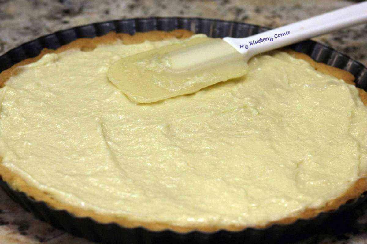 Złożyć. Krem wyjąć z lodówki, wymieszać mikserem, wyłożyć na kruche ciasto.