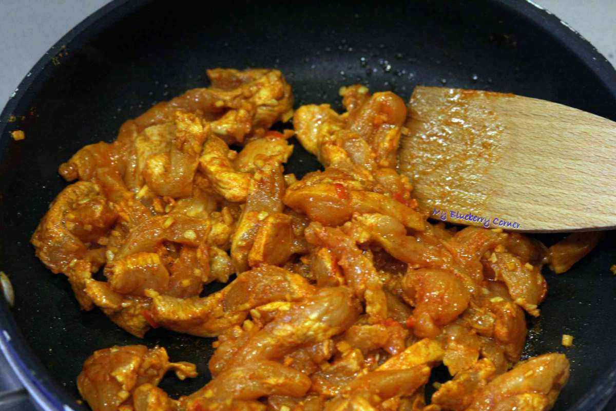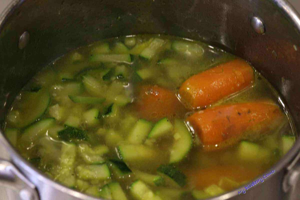 Gorący bulion dodać do warzyw i gotować kolejne 20 minut. W tym czasie kurczaka usmażyć na 1 łyżce oliwy z oliwek.