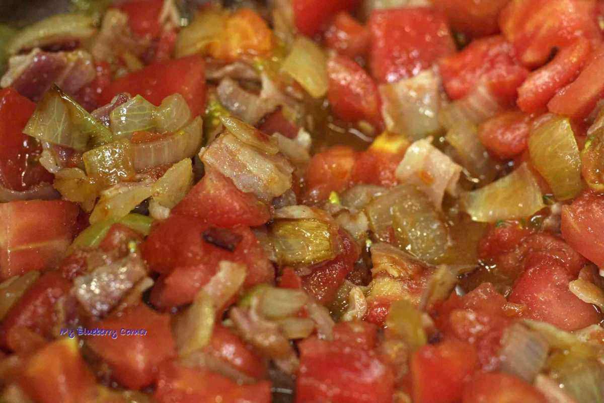 Boczek pokroić w średnią kostkę, podsmażyć na oliwie w sporym garnku. Cebulę obrać i pokroić w grubsze kawałki, dodać do boczku. Pomidory sparzyć, obrać ze skóry, pokroić w kostkę i przełożyć do garnka.