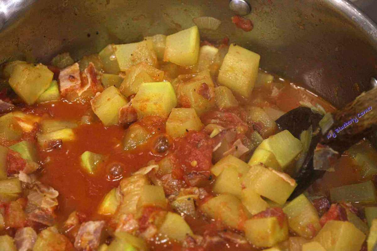 Pozostały miąższ pokroić w kostkę i dodać do wcześniej podsmażonych składników.