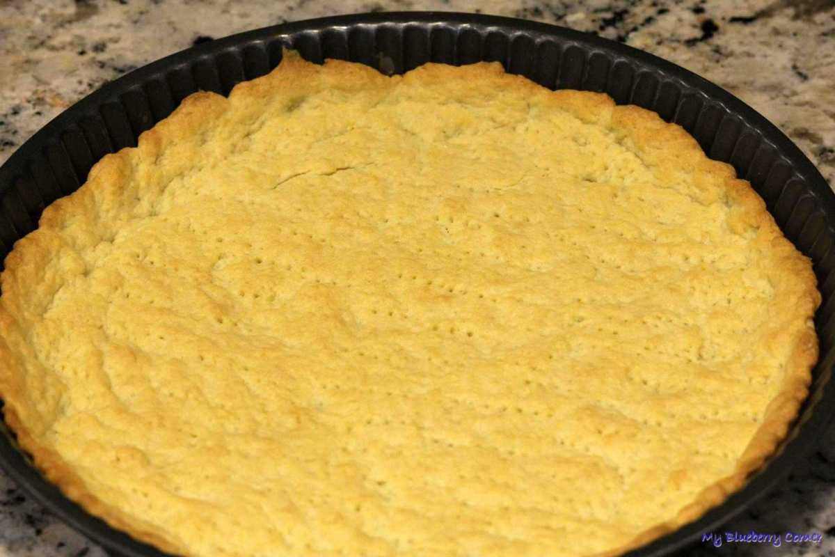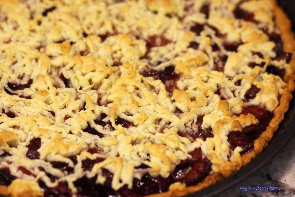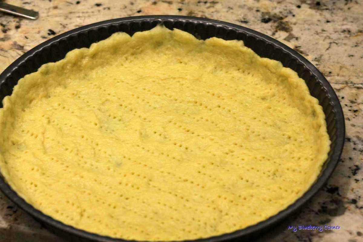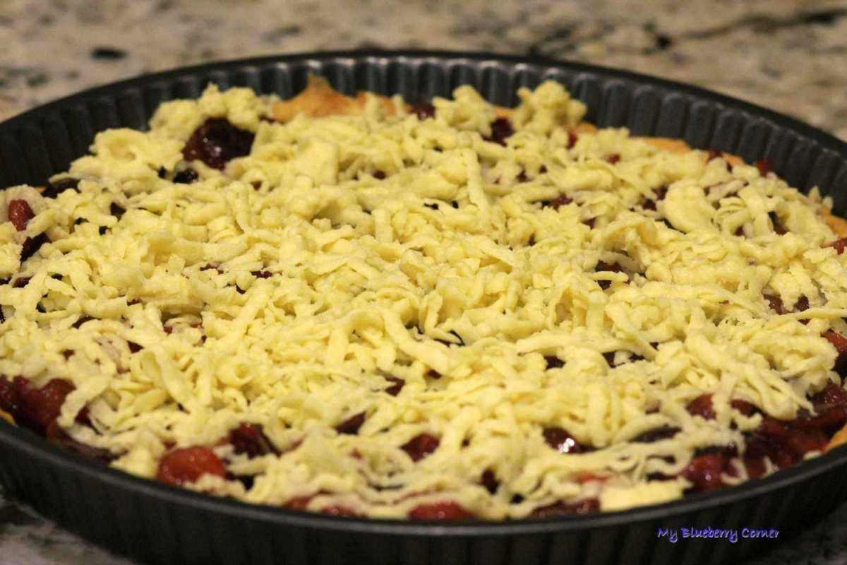 Zdjąć z ognia – owoce muszą przestygnąć. Piekarnik rozgrzać do temperatury 190°C . Większą porcją ciasta wyjąć z zamrażalnika i wylepić nią formę do tarty lub inną niedużą blachę łącznie z brzegami (dość wysoko, bo luźne ciasto troszkę może spłynąć).