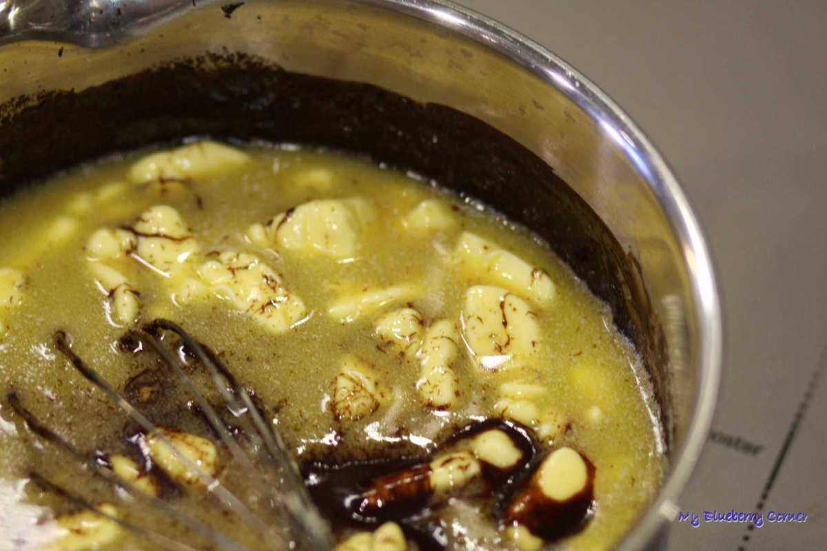 Czekoladę połamać na kawałki. Masło pokroić w kostkę. W rondlu zagotować wodę z cukrem. Gdy cukier się rozpuści, dodać czekoladę, a następnie masło.