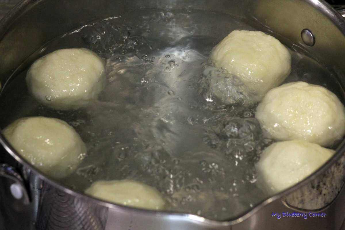 W dużym garnku zagotować dużą ilość wody. Gotować po kilka knedli, wrzucając je do wrzątku.