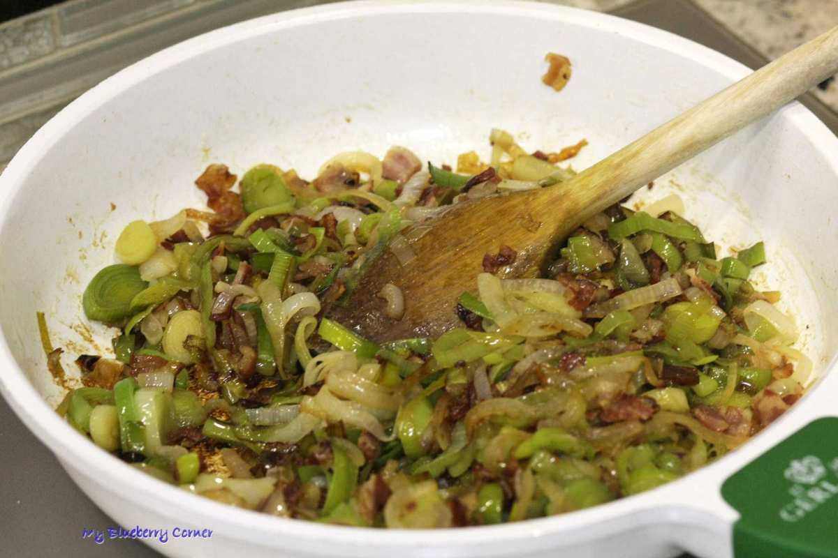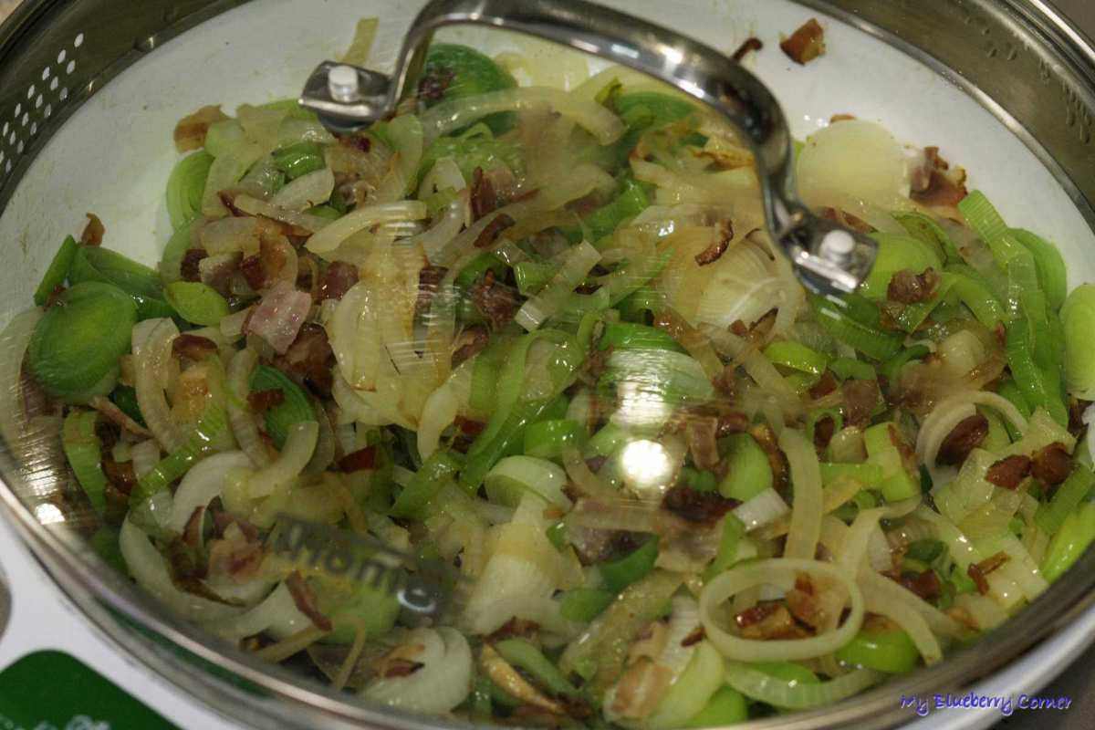 Do boczku dodać pokrojone pory i dusić pod przykryciem przez 10 minut.