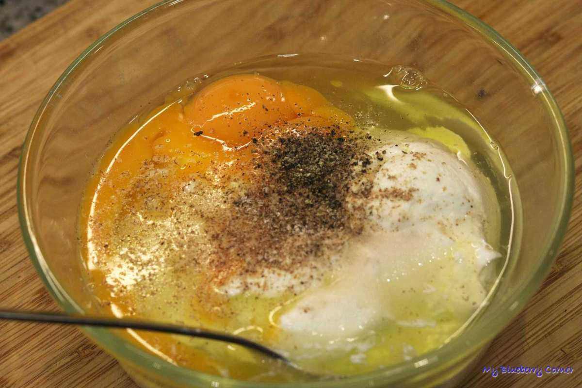 Jogurt przełożyć do miski, dodać jajka i przyprawy, wymieszać.