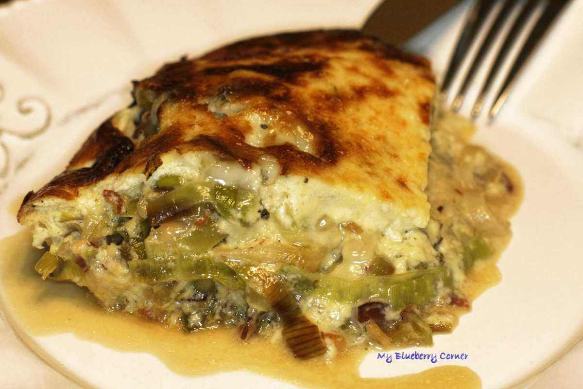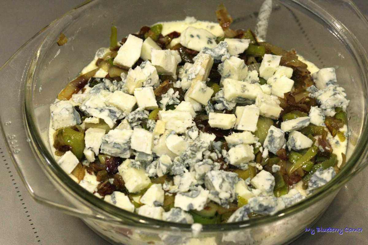 Żaroodporną formę wysmarować oliwą z oliwek. Na dno wyłożyć połowę porów z boczkiem, na to wysypać trochę gorgonzoli i zalać częścią jogurtu z jajkami. Potem druga połowa porów, gorgonzola i jogurt z jajkami.