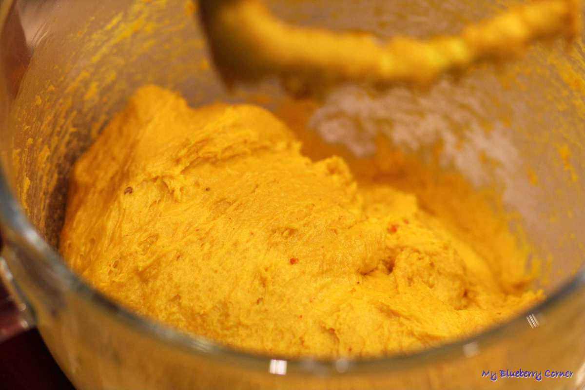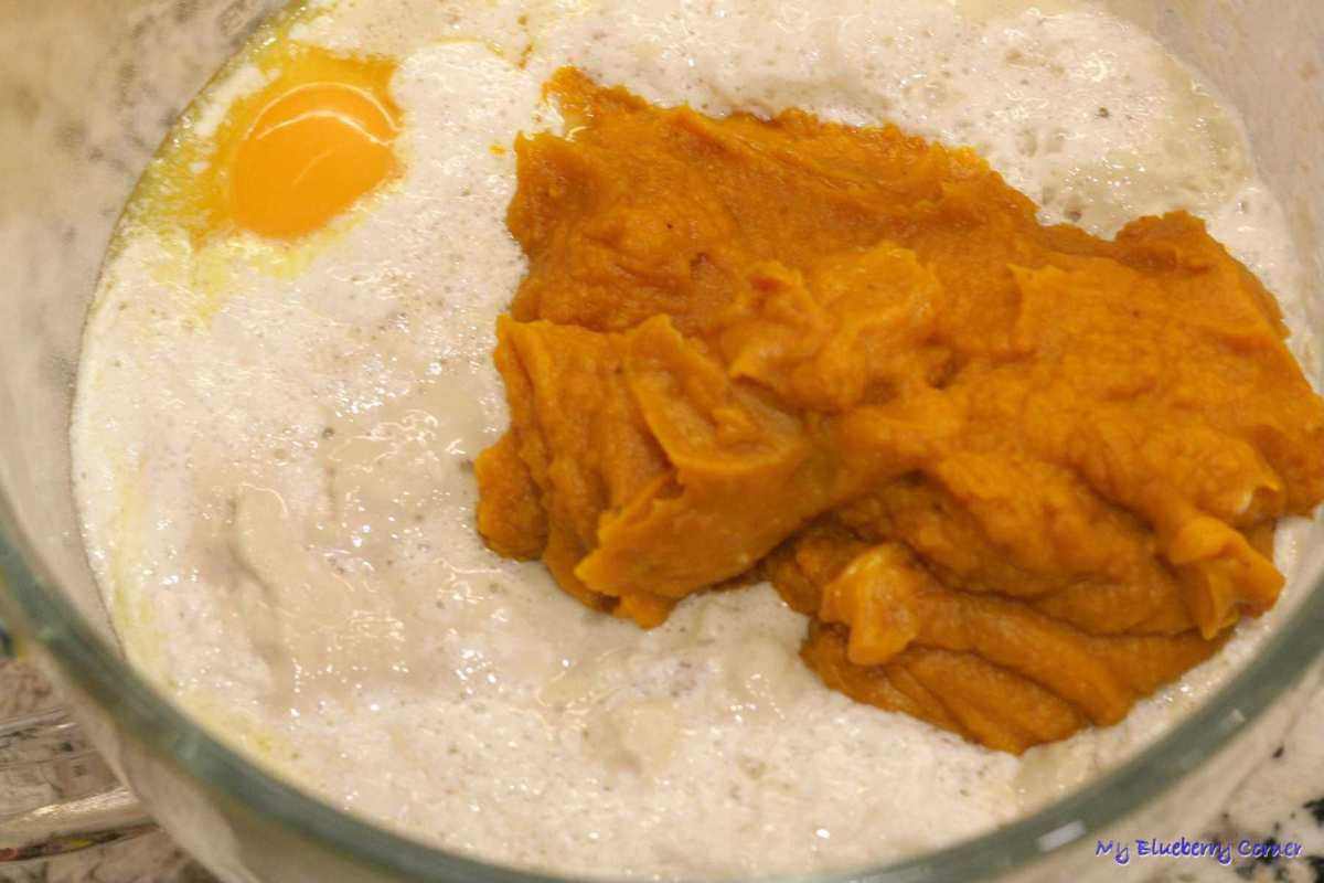 Do miski wsypać mąkę, dodać letnie mleko, rozpuszczone i ostudzone masło, żółtko i jajko, cukier, purée z dyni i drożdżowy zaczyn.