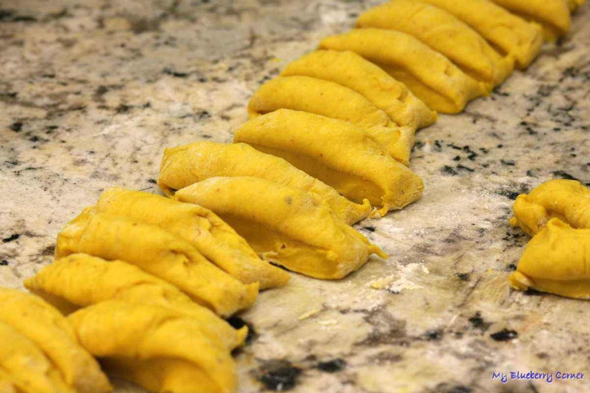 Wyrośnięte ciasto wyjąć na blat, uformować z niego wałek i podzielić na 24 kawałki.