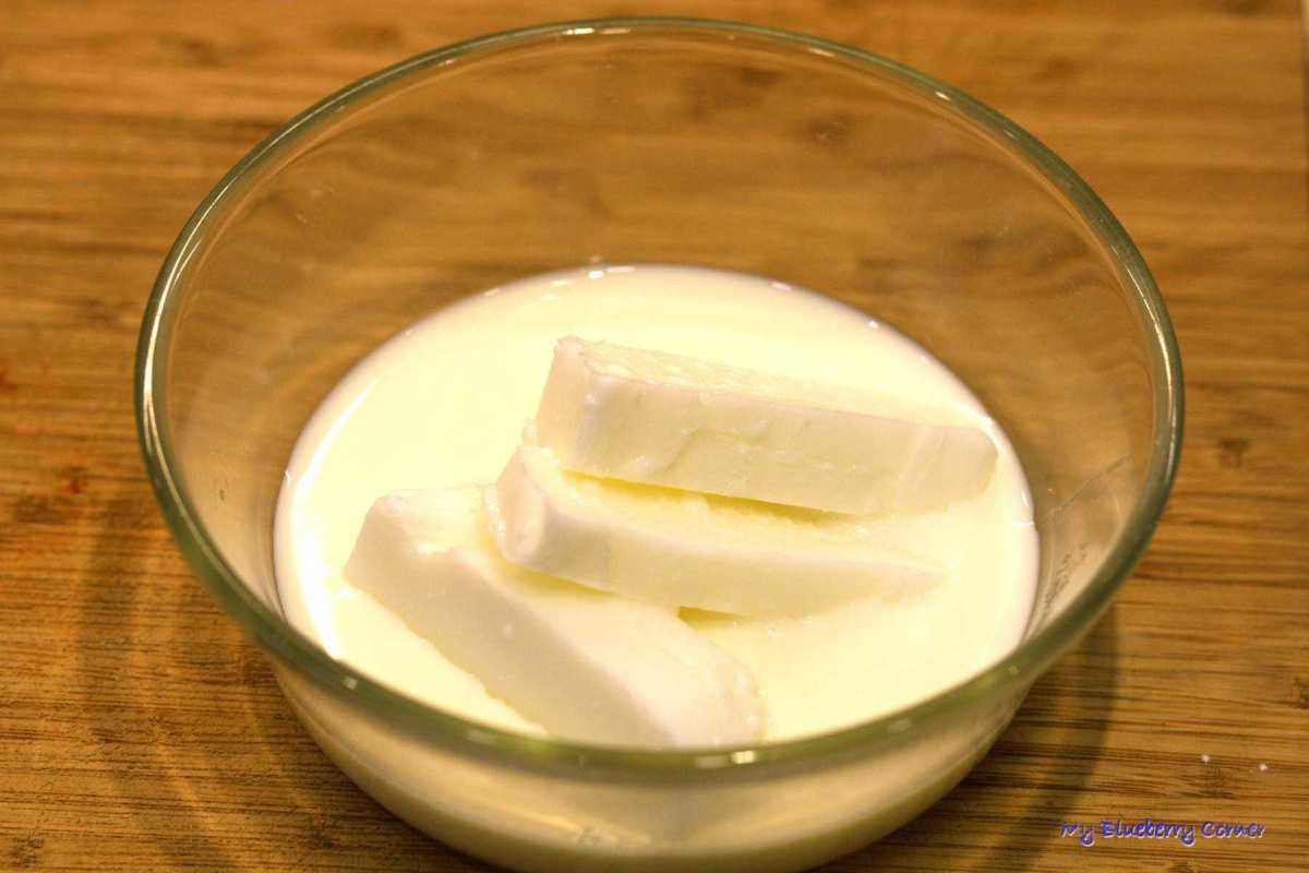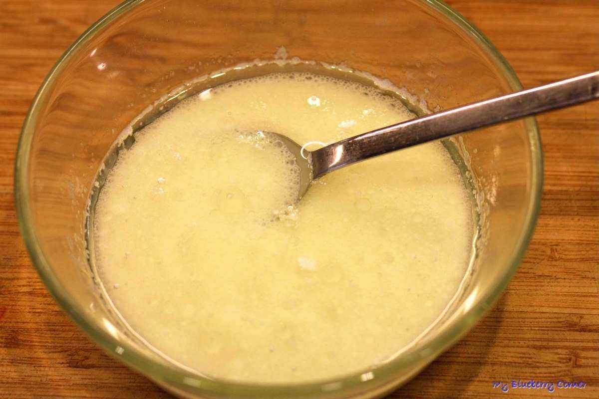 W tym czasie przygotować ciasto. Do małego garnka włożyć smalec i rozpuścić na małym ogniu, dodać mleko i grzać jeszcze przez chwilę, aż mleko będzie dobrze ciepłe, można też włożyć smalec i mleko do salaterki i podgrzać w mikrofalówce.