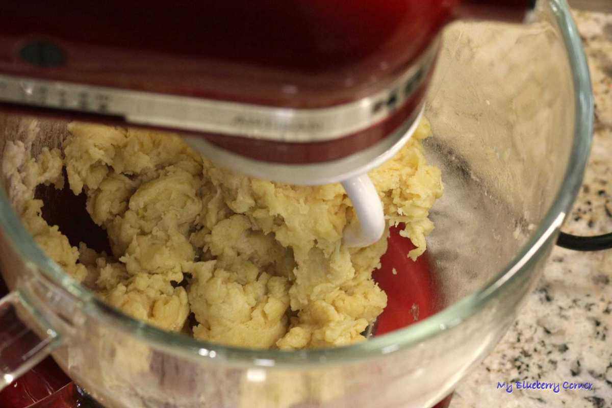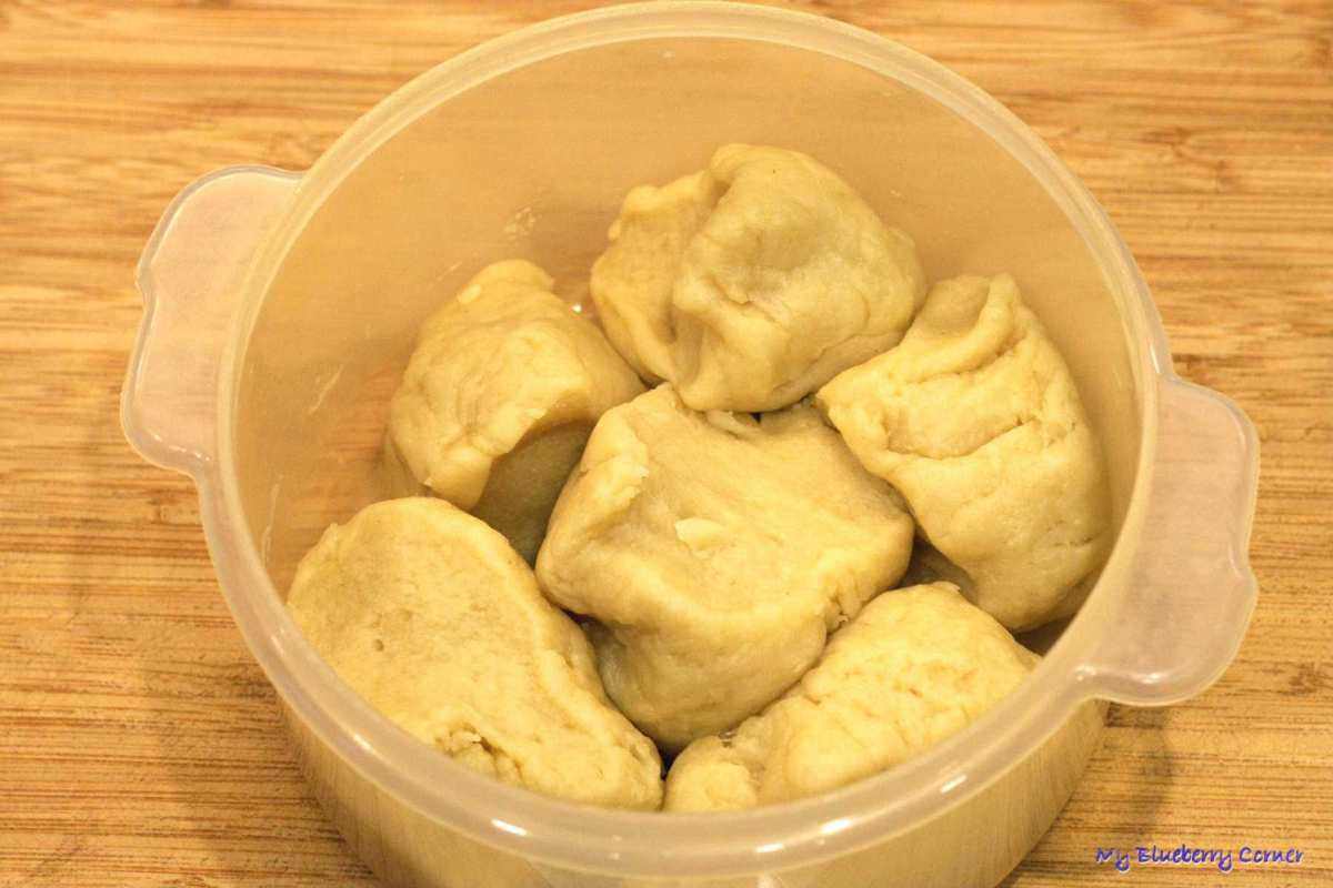 Gdy cały płyn zmieszamy z mąką, ciasto wyjąć z miski, szybko zagnieść i podzielić na 6 części. Schować do pojemnika odstawić.
