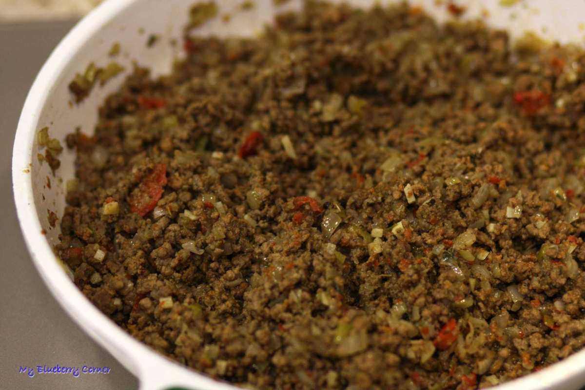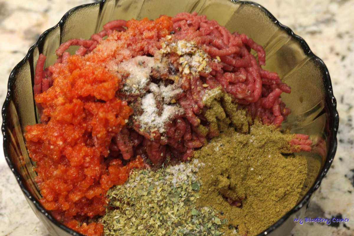 Mięso i przyprawy wymieszać i przełożyć na patelnię. Całość smażyć przez 10 minut.