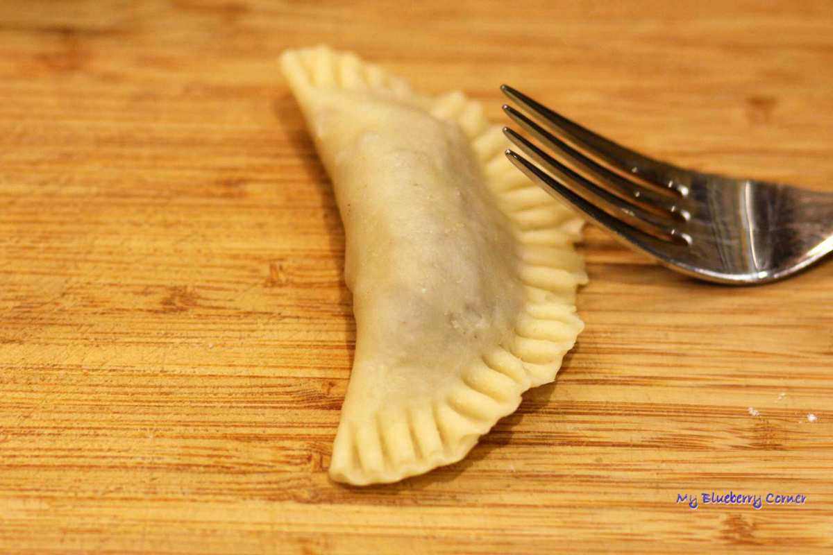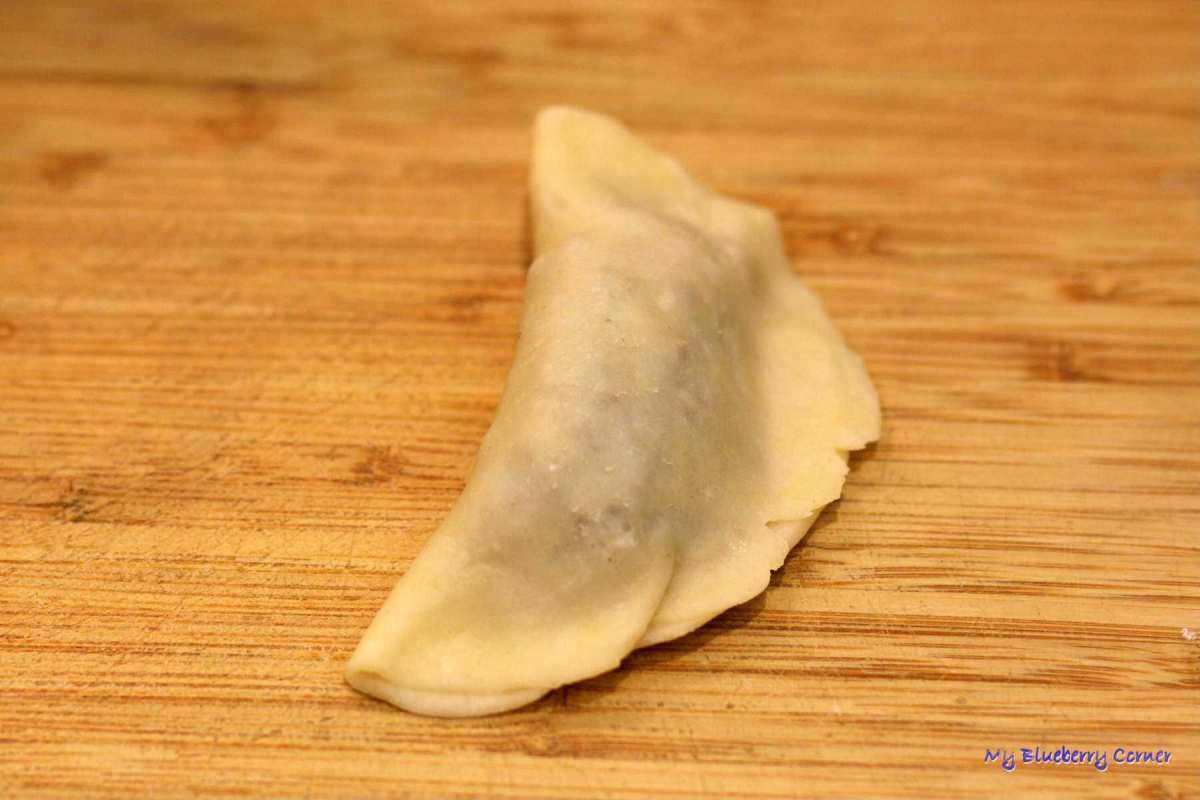 Placek zawinąć w pieróg, ciasno skleić brzegi (można zagnieść je widelcem).