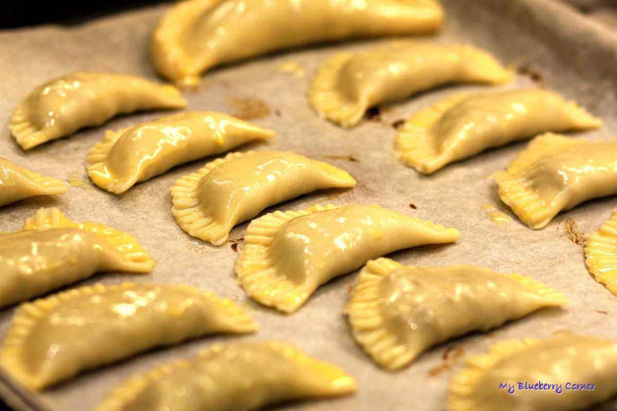 Gotowe empanadas układać na wyłożoną papierem blachę, posmarować każdy roztrzepanym żółtkiem z mlekiem.
