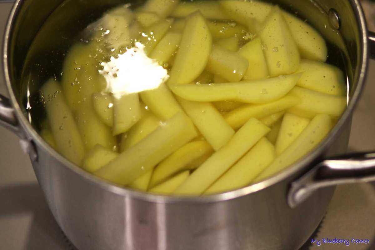 Umyte, pokrojone ziemniaki wrzucić do wrzącej posłodzonej wody i gotować 3 minuty.
