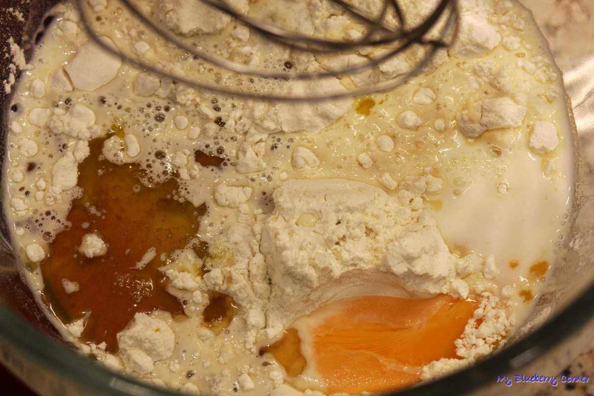 Rozgrzać gofrownicę. W jednej misce zmieszać mleko, mąkę, proszek do pieczenia, olej arachidowy, żółtko i cukier z wanilią. Całość wymieszać na gładką, jednolitą masę.