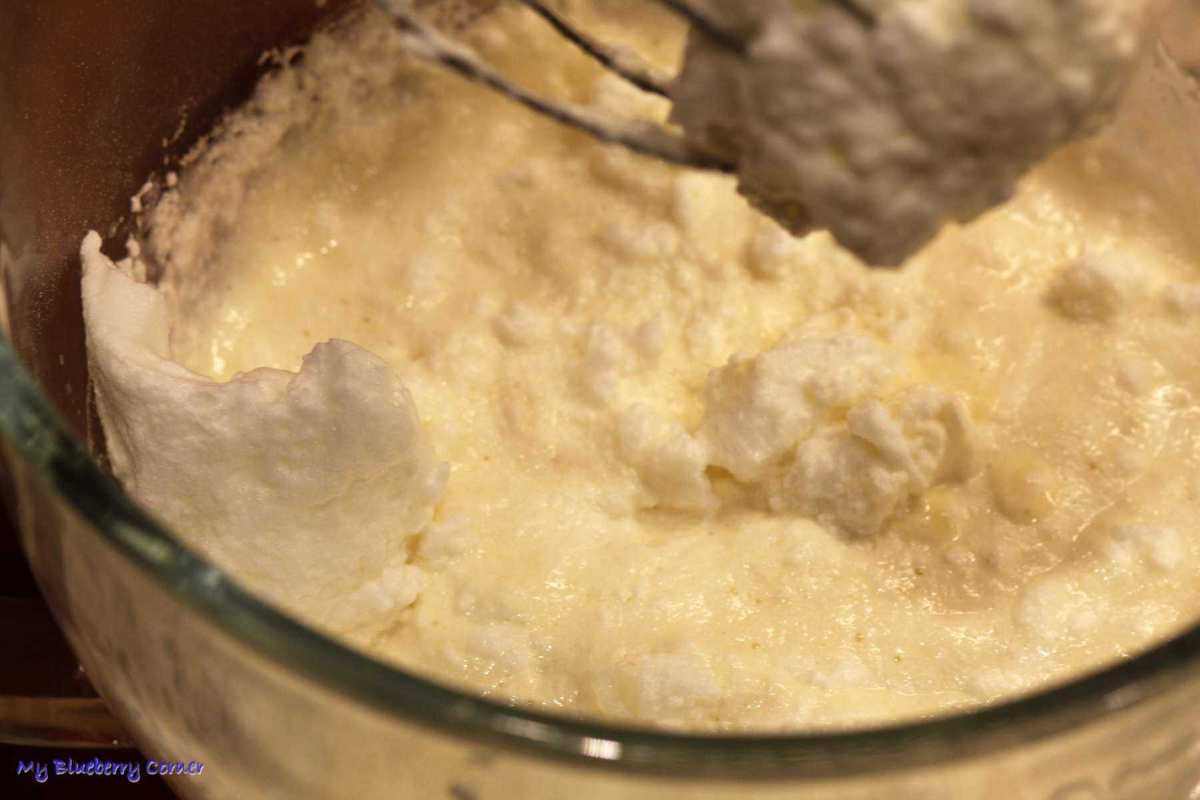 W drugiej misce ubić na sztywno białko jajka ze szczyptą soli, następnie przełożyć do pierwszej miski i delikatnie wymieszać wszystko łyżką.