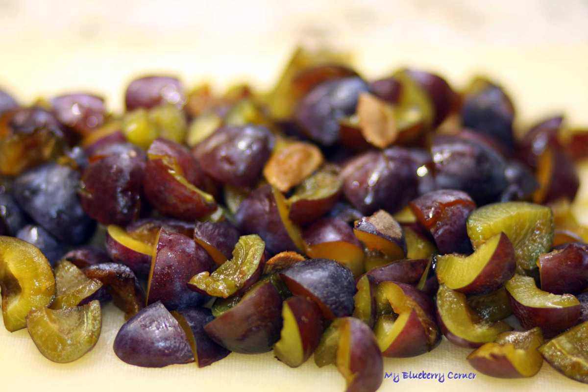 Dojrzałe śliwki wydrylować, zostawiając kilka pestek, pokroić na ćwiartki.